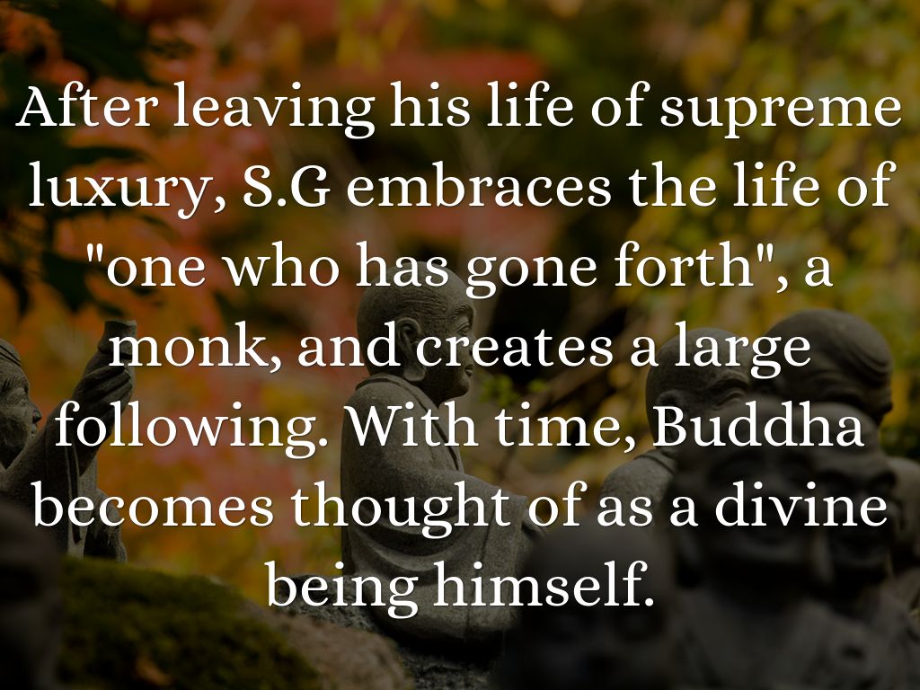 After leaving his life of supreme luxury, S.G embraces the life of "one who has gone forth", a monk, and creates a large following. With time, Buddha becomes thought of as a divine being himself.
