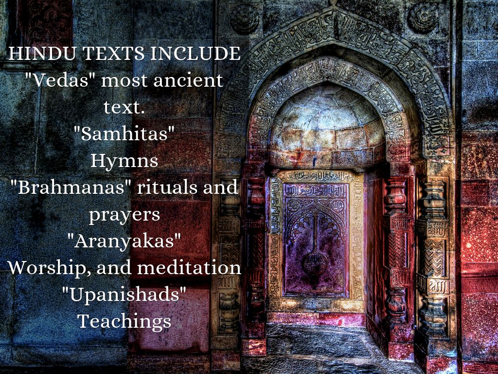 HINDU TEXTS INCLUDE "Vedas" most ancient text. "Samhitas" Hymns "Brahmanas" rituals and prayers "Aranyakas" Worship, and meditation "Upanishads" Teachings