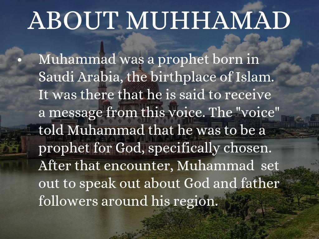 Muhammad was a prophet born in Saudi Arabia, the birthplace of Islam. It was there that he is said to receive a message from this voice. The "voice" told Muhammad that he was to be a prophet for God, specifically chosen. After that encounter, Muhammad set out to speak out about God and father followers around his region.