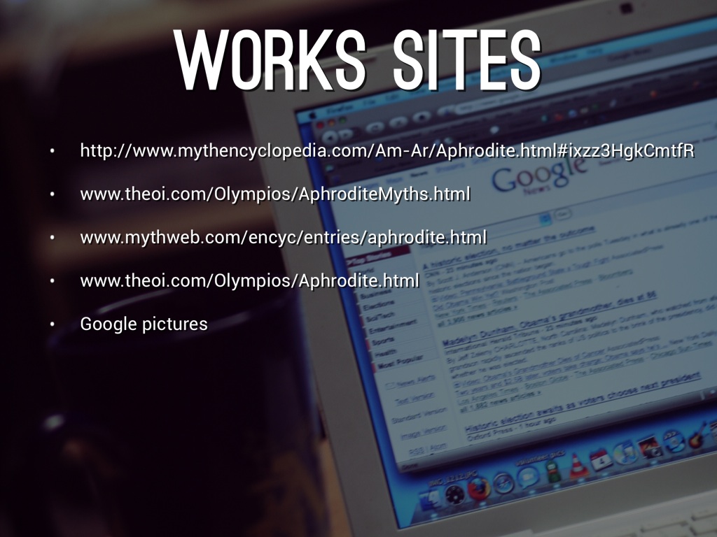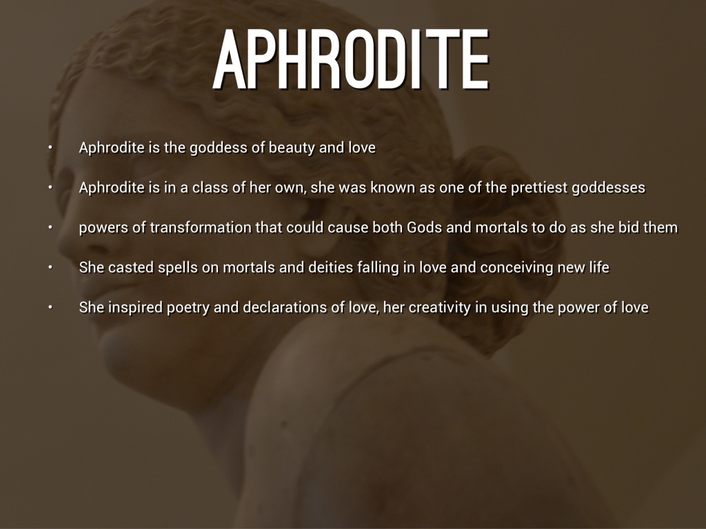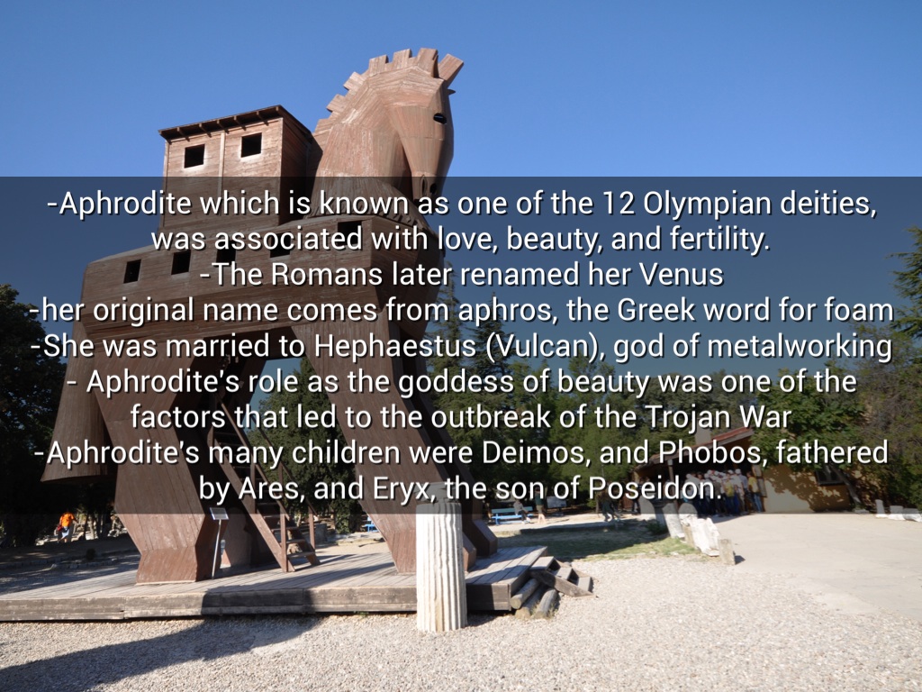 -Aphrodite which is known as one of the 12 Olympian deities, was associated with love, beauty, and fertility. -The Romans later renamed her Venus -her original name comes from aphros, the Greek word for foam -She was married to Hephaestus (Vulcan), god of metalworking - Aphrodite's role as the goddess of beauty was one of the factors that led to the outbreak of the Trojan War -Aphrodite's many children were Deimos, and Phobos, fathered by Ares, and Eryx, the son of Poseidon.