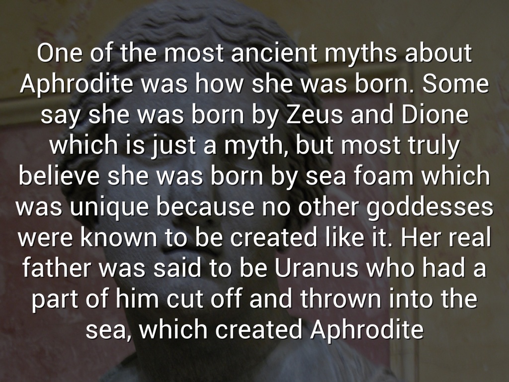 One of the most ancient myths about Aphrodite was how she was born. Some say she was born by Zeus and Dione which is just a myth, but most truly believe she was born by sea foam which was unique because no other goddesses were known to be created like it. Her real father was said to be Uranus who had a part of him cut off and thrown into the sea, which created Aphrodite