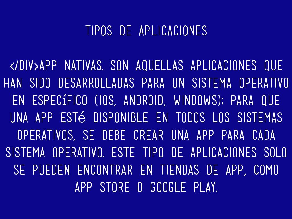App Nativas. Son aquellas aplicaciones que han sido desarrolladas para un sistema operativo en específico (iOs, Android, Windows); para que una app esté disponible en todos los sistemas operativos, se debe crear una app para cada sistema operativo. Este tipo de aplicaciones solo se pueden encontrar en tiendas de app, como App Store o Google Play.