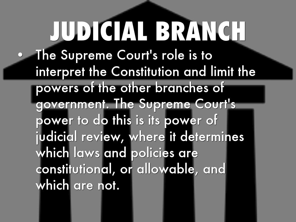 The Supreme Court's role is to interpret the Constitution and limit the powers of the other branches of government. The Supreme Court's power to do this is its power of judicial review, where it determines which laws and policies are constitutional, or allowable, and which are not.