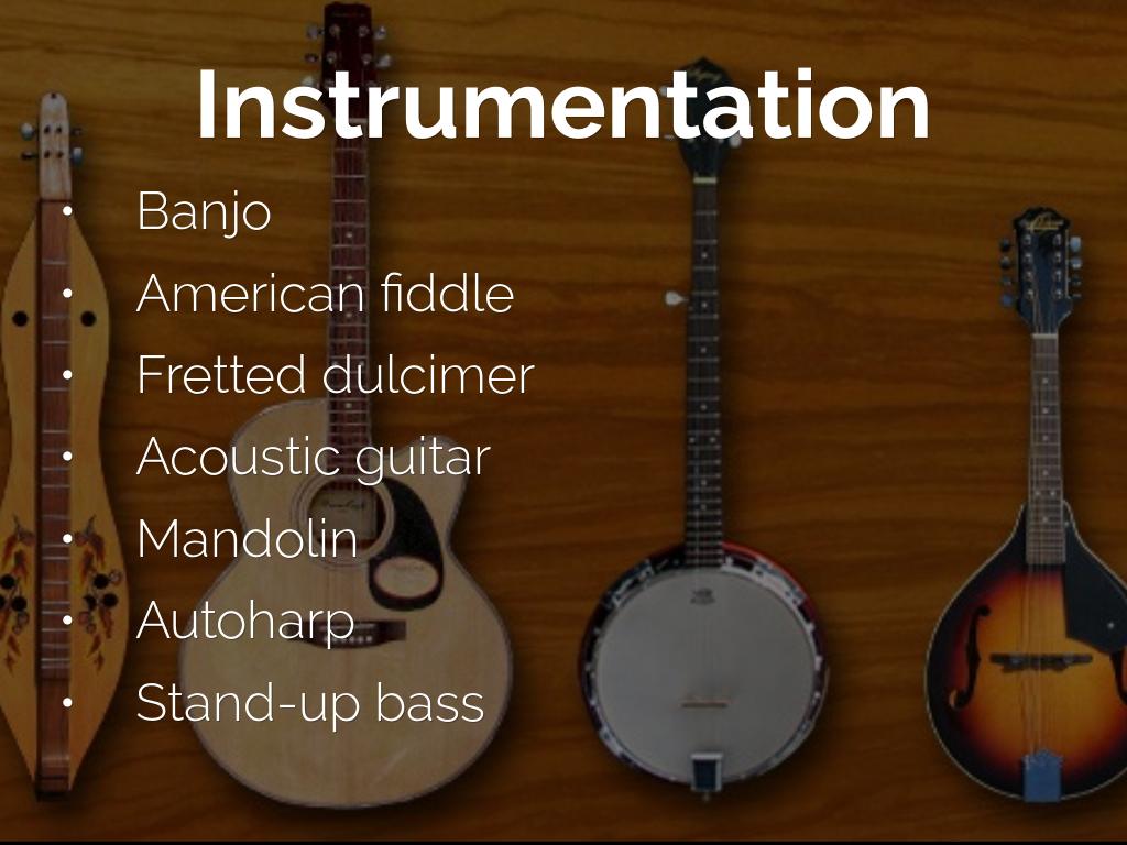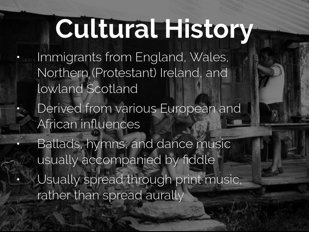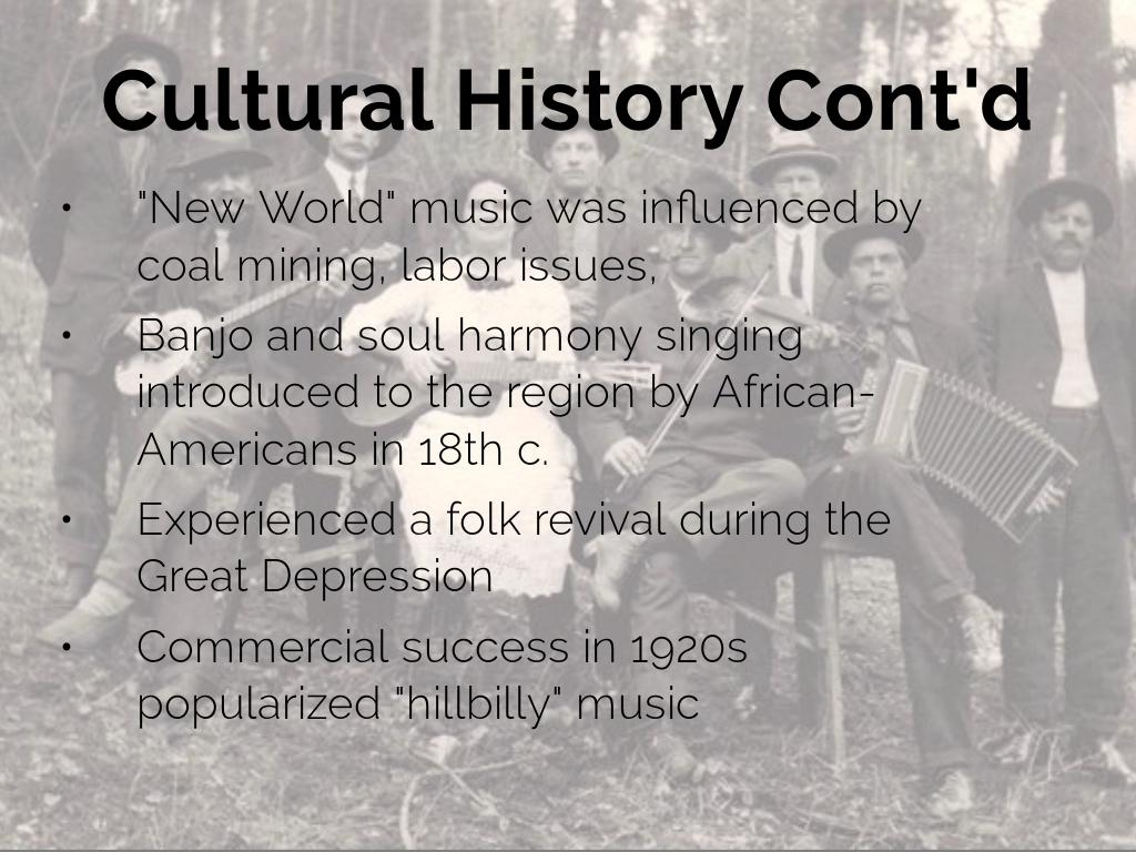 • Banjo and soul harmony singing introduced to the region by African-Americans in 18th c.