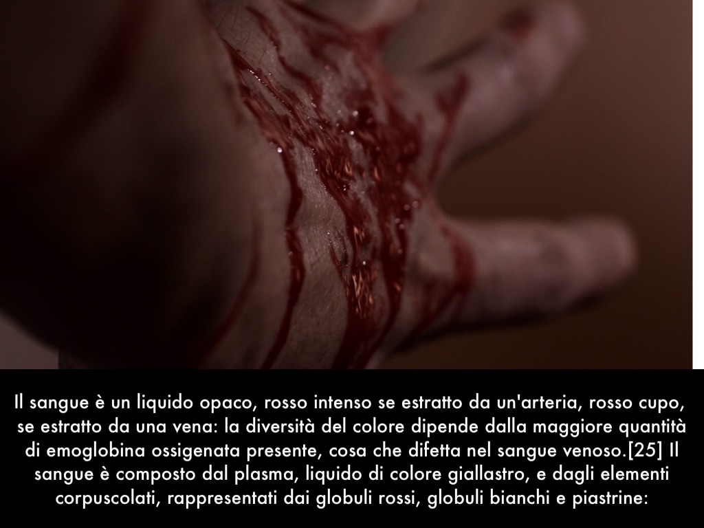 Il sangue è un liquido opaco, rosso intenso se estratto da un'arteria, rosso cupo, se estratto da una vena: la diversità del colore dipende dalla maggiore quantità di emoglobina ossigenata presente, cosa che difetta nel sangue venoso.[25] Il sangue è composto dal plasma, liquido di colore giallastro, e dagli elementi corpuscolati, rappresentati dai globuli rossi, globuli bianchi e piastrine: