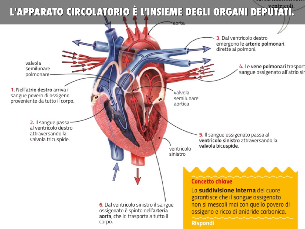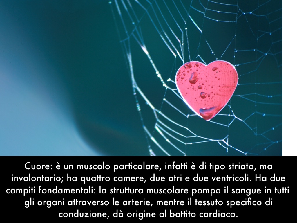 Cuore: è un muscolo particolare, infatti è di tipo striato, ma involontario; ha quattro camere, due atri e due ventricoli. Ha due compiti fondamentali: la struttura muscolare pompa il sangue in tutti gli organi attraverso le arterie, mentre il tessuto specifico di conduzione, dà origine al battito cardiaco.