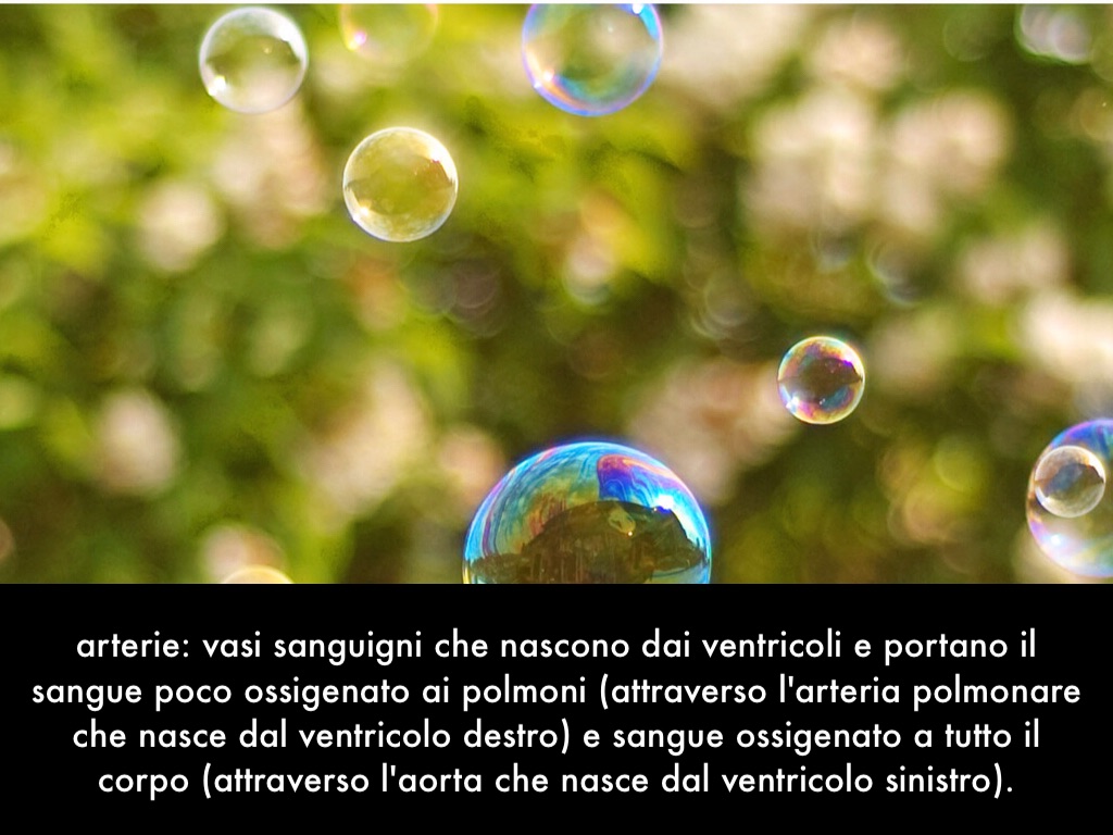 arterie: vasi sanguigni che nascono dai ventricoli e portano il sangue poco ossigenato ai polmoni (attraverso l'arteria polmonare che nasce dal ventricolo destro) e sangue ossigenato a tutto il corpo (attraverso l'aorta che nasce dal ventricolo sinistro).