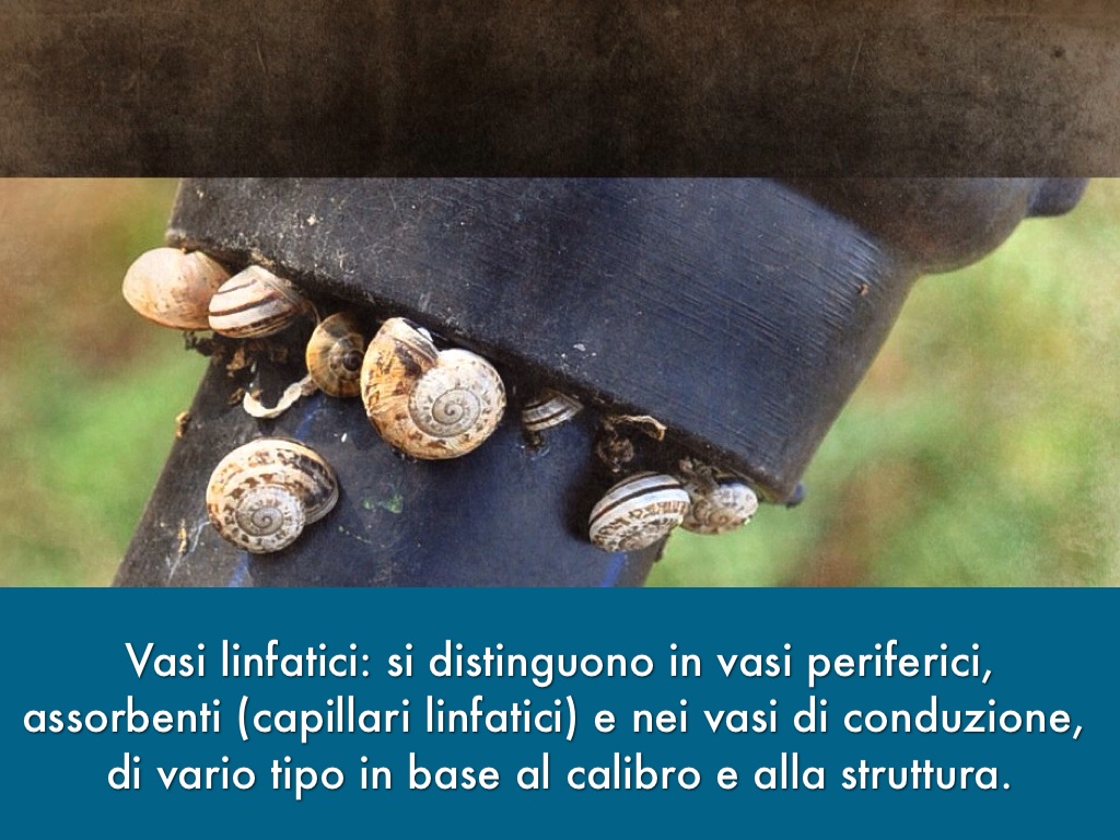Vasi linfatici: si distinguono in vasi periferici, assorbenti (capillari linfatici) e nei vasi di conduzione, di vario tipo in base al calibro e alla struttura.