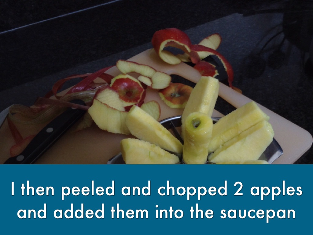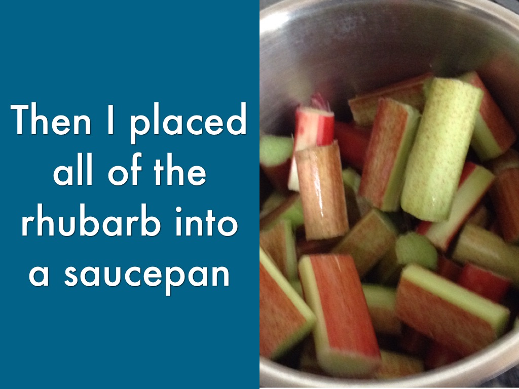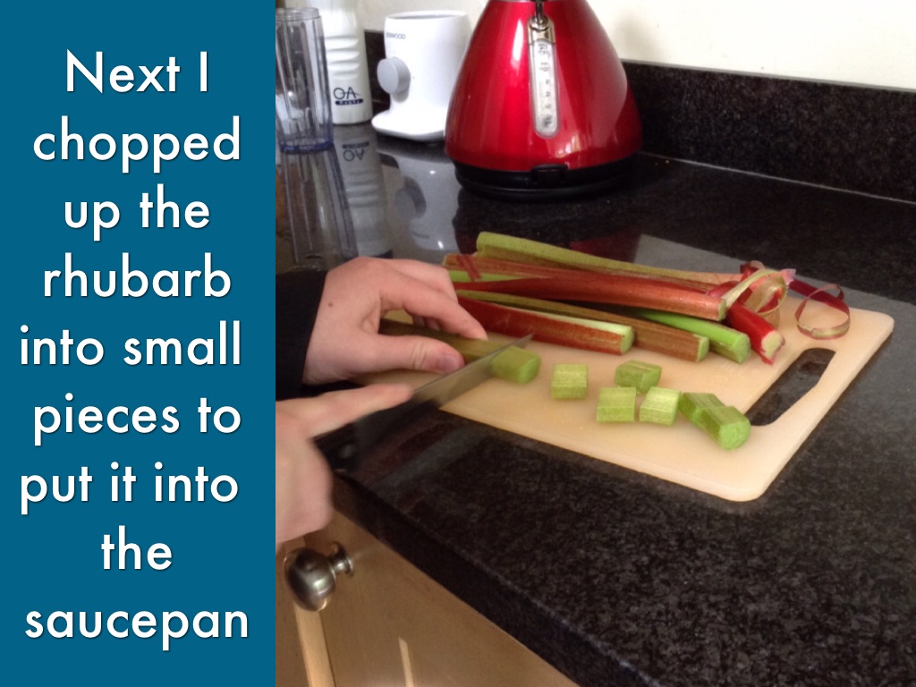 Next I chopped up the rhubarb into small pieces to put it into the saucepan