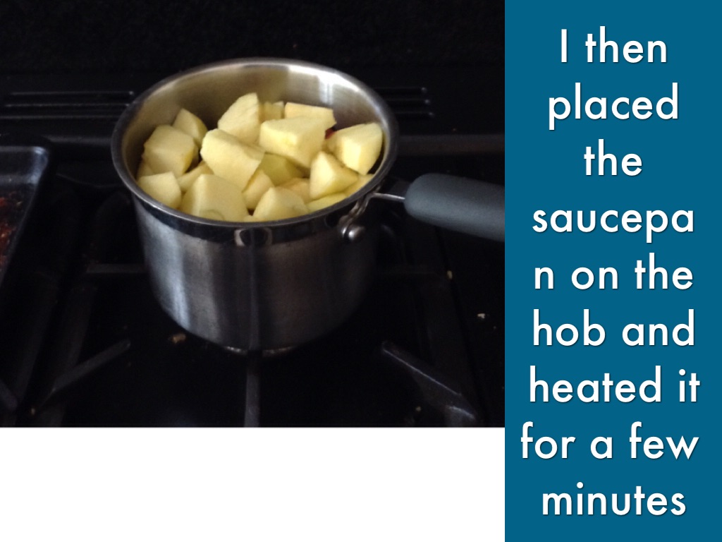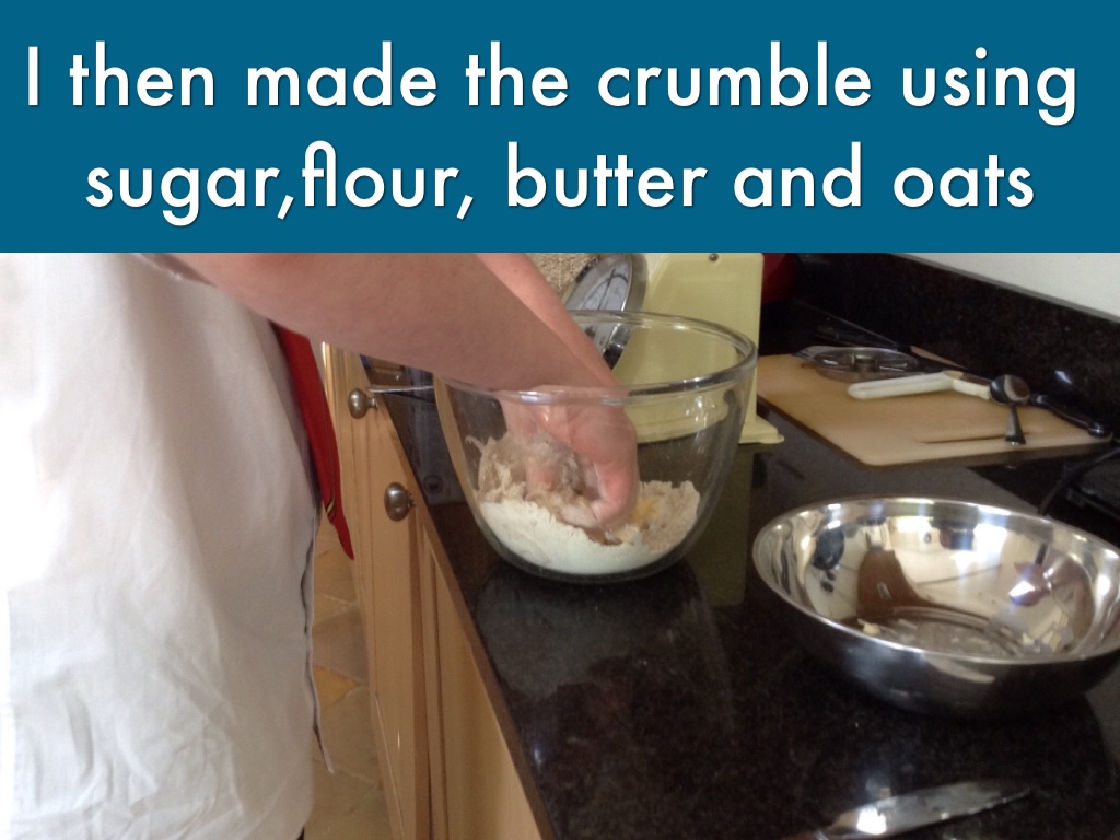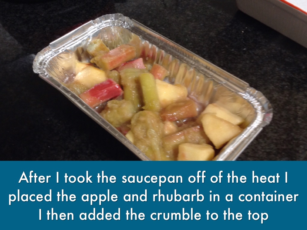 After I took the saucepan off of the heat I placed the apple and rhubarb in a container I then added the crumble to the top