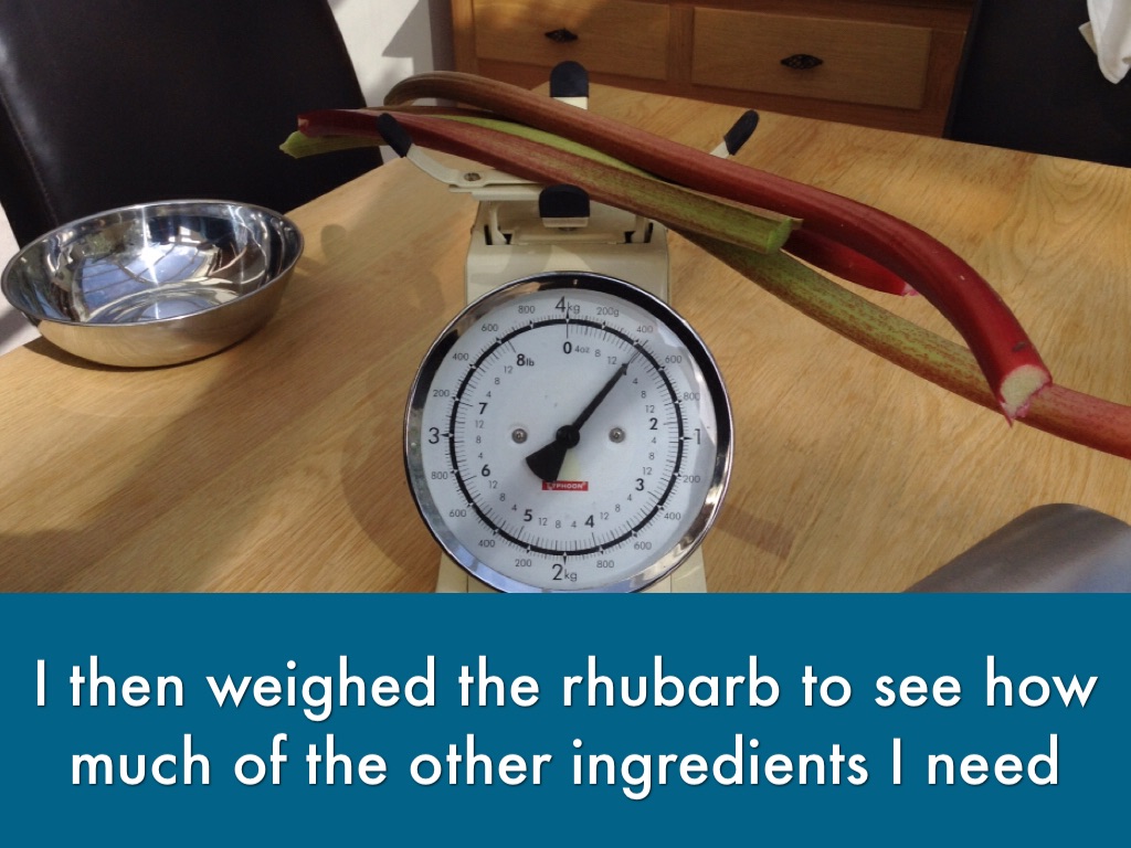 I then weighed the rhubarb to see how much of the other ingredients I need