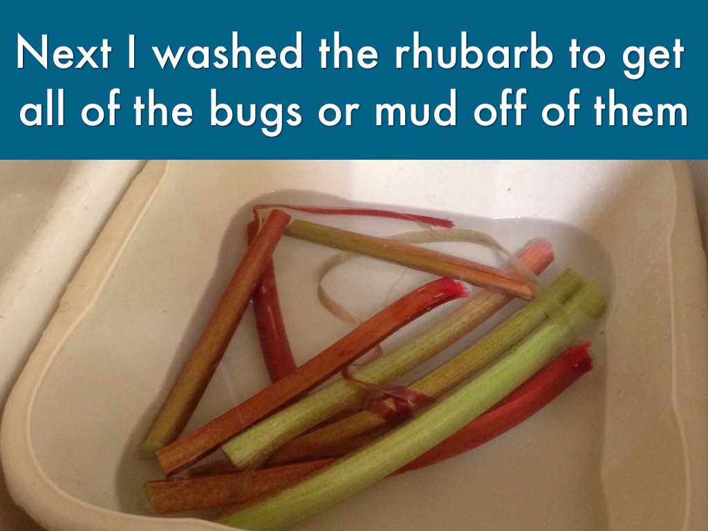 Next I washed the rhubarb to get all of the bugs or mud off of them