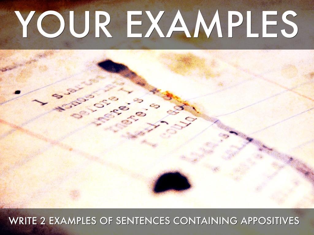 WRITE 2 EXAMPLES OF SENTENCES CONTAINING APPOSITIVES