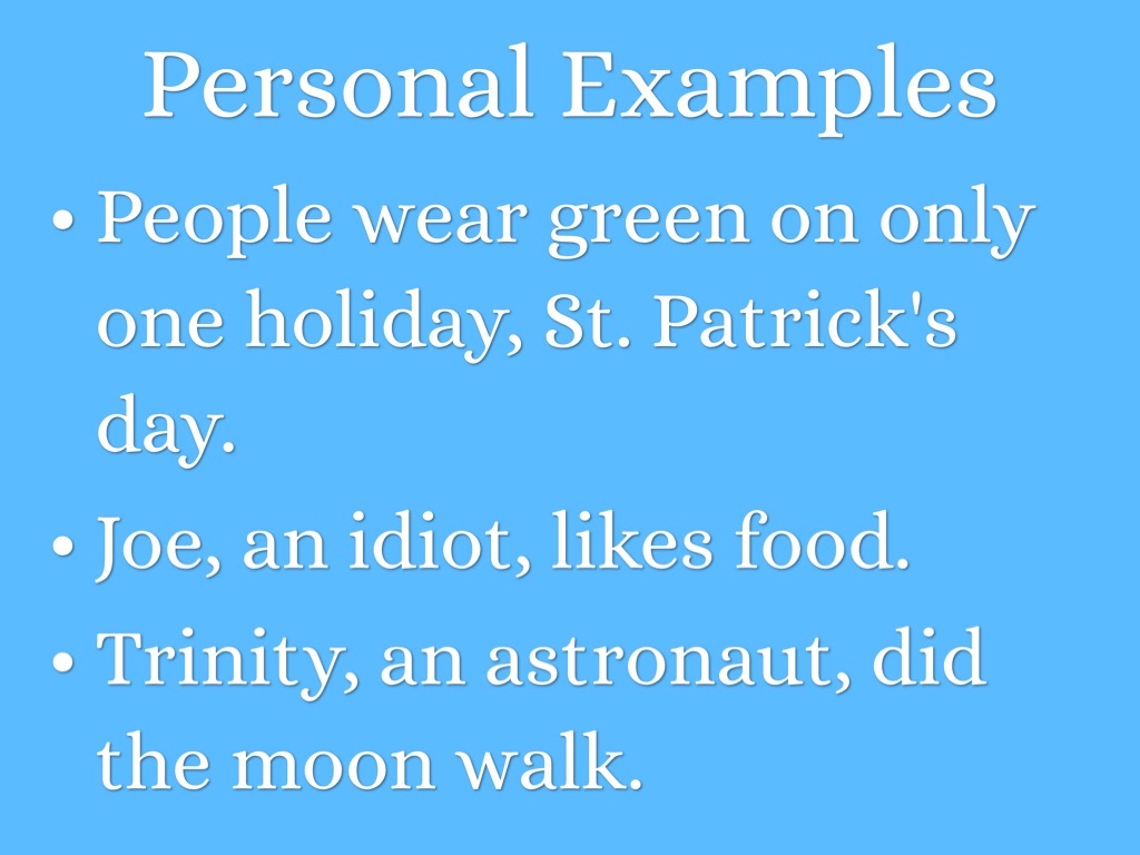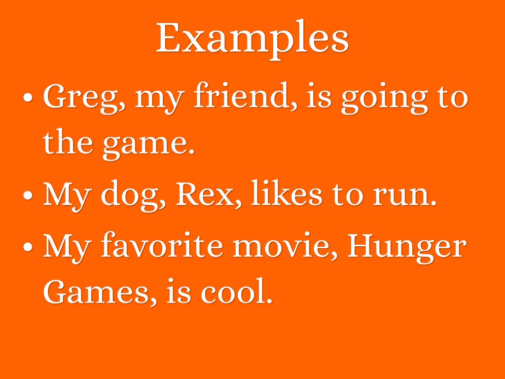 • Appositive- additional information that is not needed in the sentence.
