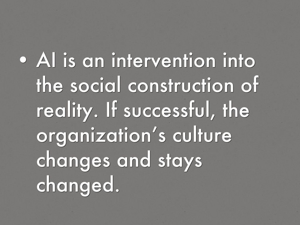 AI is an intervention into the social construction of reality. If successful, the organization’s culture changes and stays changed.