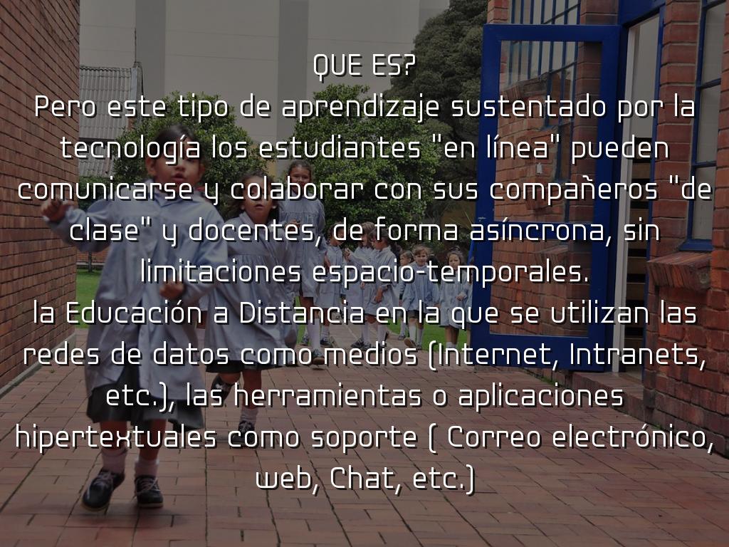 QUE ES? Pero este tipo de aprendizaje sustentado por la tecnología los estudiantes "en línea" pueden comunicarse y colaborar con sus compañeros "de clase" y docentes, de forma asíncrona, sin limitaciones espacio-temporales. la Educación a Distancia en la que se utilizan las redes de datos como medios (Internet, Intranets, etc.), las herramientas o aplicaciones hipertextuales como soporte ( Correo electrónico, web, Chat, etc.)