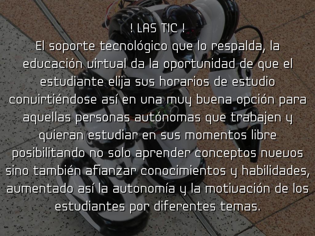 ! LAS TIC ! El soporte tecnológico que lo respalda, la educación virtual da la oportunidad de que el estudiante elija sus horarios de estudio convirtiéndose así en una muy buena opción para aquellas personas autónomas que trabajen y quieran estudiar en sus momentos libre posibilitando no solo aprender conceptos nuevos sino también afianzar conocimientos y habilidades, aumentado así la autonomía y la motivación de los estudiantes por diferentes temas.
