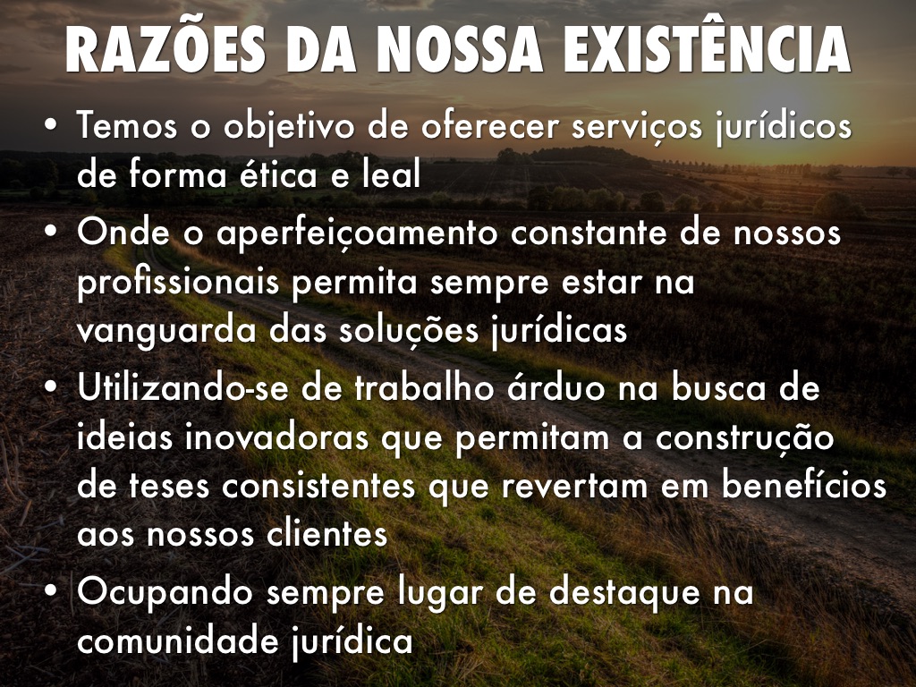 Utilizando-se de trabalho árduo na busca de ideias inovadoras que permitam a construção de teses consistentes que revertam em benefícios aos nossos clientes
