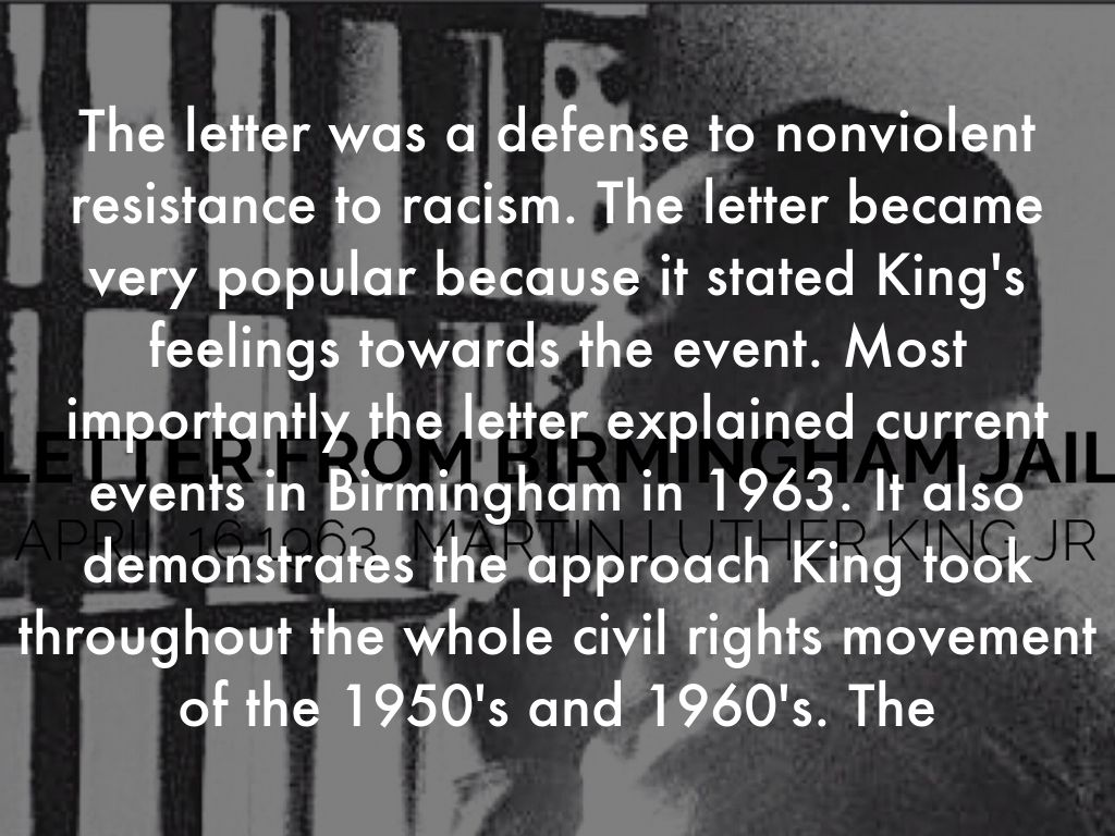 The letter was a defense to nonviolent resistance to racism. The letter became very popular because it stated King's feelings towards the event. Most importantly the letter explained current events in Birmingham in 1963. It also demonstrates the approach King took throughout the whole civil rights movement of the 1950's and 1960's. The