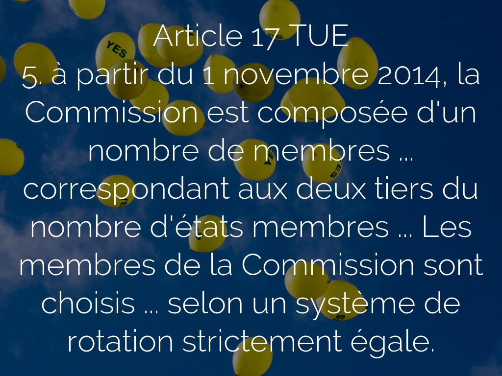 Article 17 TUE 5. à partir du 1 novembre 2014, la Commission est composée d'un nombre de membres ... correspondant aux deux tiers du nombre d'états membres ... Les membres de la Commission sont choisis ... selon un système de rotation strictement égale.