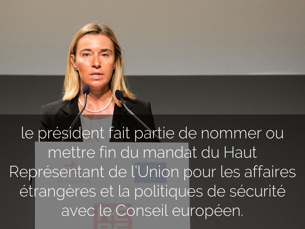 le président fait partie de nommer ou mettre fin du mandat du Haut Représentant de l’Union pour les affaires étrangères et la politiques de sécurité avec le Conseil européen.
