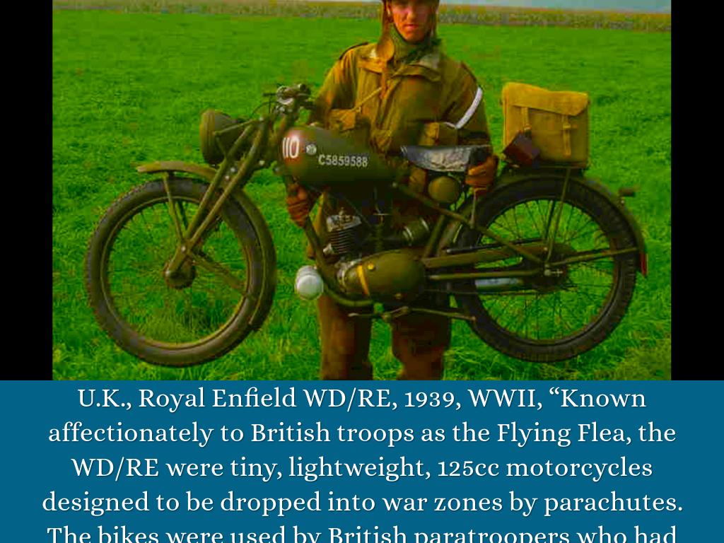 U.K., Royal Enfield WD/RE, 1939, WWII, “Known affectionately to British troops as the Flying Flea, the WD/RE were tiny, lightweight, 125cc motorcycles designed to be dropped into war zones by parachutes. The bikes were used by British paratroopers who had been dropped behind enemy lines to establish safe communications with one another.”