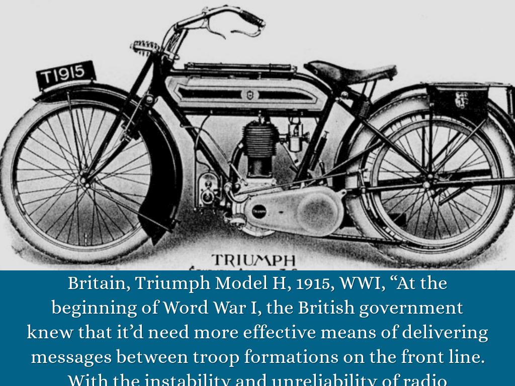 Britain, Triumph Model H, 1915, WWI, “At the beginning of Word War I, the British government knew that it’d need more effective means of delivering messages between troop formations on the front line. With the instability and unreliability of radio transmissions, along with the severe antiquation of conventional horse messaging, the Brits decided the route was one best traveled on two wheels.”