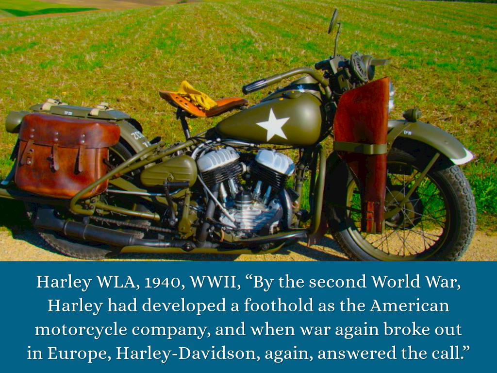 Harley WLA, 1940, WWII, “By the second World War, Harley had developed a foothold as the American motorcycle company, and when war again broke out in Europe, Harley-Davidson, again, answered the call.”