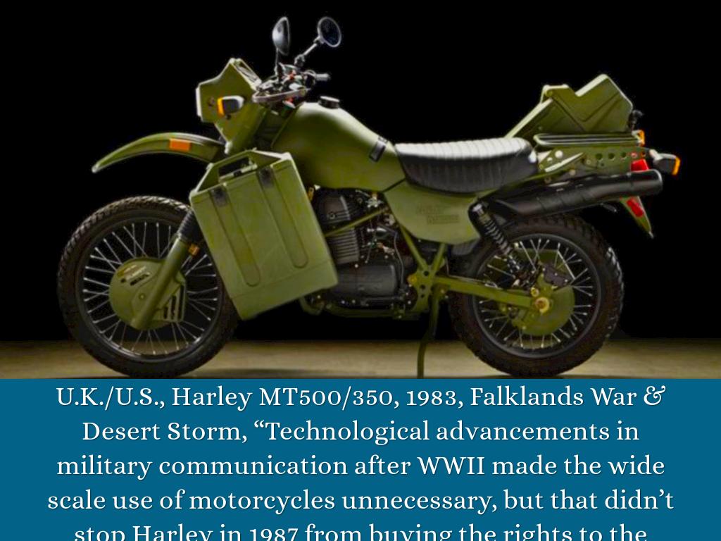 U.K./U.S., Harley MT500/350, 1983, Falklands War & Desert Storm, “Technological advancements in military communication after WWII made the wide scale use of motorcycles unnecessary, but that didn’t stop Harley in 1987 from buying the rights to the Armstrong MT 500, a British military dual sport motorcycle that gained popularity for its agility, versatility, and reliability. The single-cylinder 482cc Rotax four-stroke turns out a stout 32 hp, making the MT500 a real blast to ride. Its younger brother, the MT 350, clocks in at just under 30 hp.”