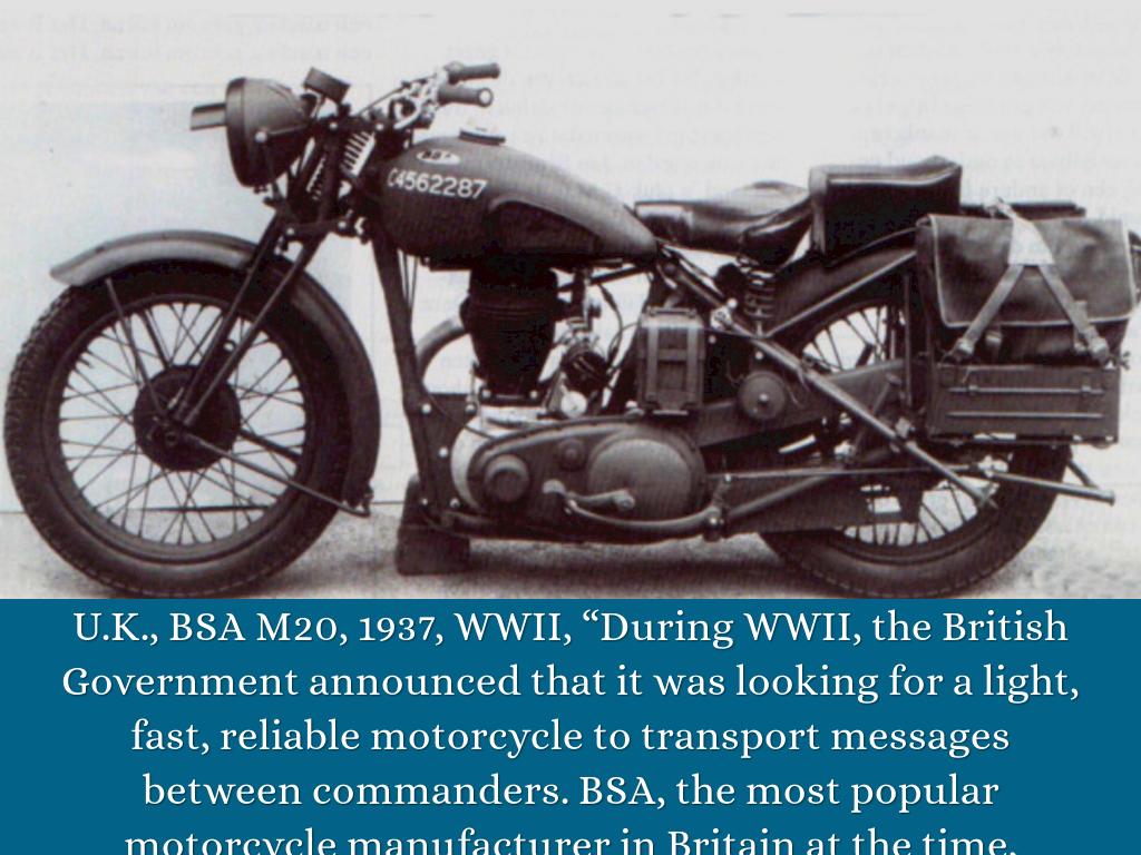 U.K., BSA M20, 1937, WWII, “During WWII, the British Government announced that it was looking for a light, fast, reliable motorcycle to transport messages between commanders. BSA, the most popular motorcycle manufacturer in Britain at the time, submitted the M20—a heavy-framed, side car-mounted cow of a bike, powered by a low-compression 500cc single-cylinder.”