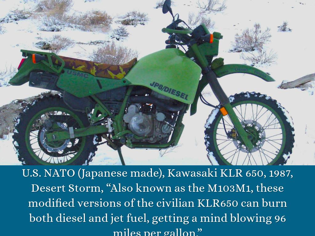 U.S. NATO (Japanese made), Kawasaki KLR 650, 1987, Desert Storm, “Also known as the M103M1, these modified versions of the civilian KLR650 can burn both diesel and jet fuel, getting a mind blowing 96 miles per gallon.”