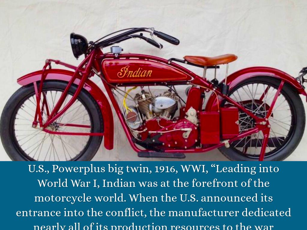 U.S., Powerplus big twin, 1916, WWI, “Leading into World War I, Indian was at the forefront of the motorcycle world. When the U.S. announced its entrance into the conflict, the manufacturer dedicated nearly all of its production resources to the war effort.”
