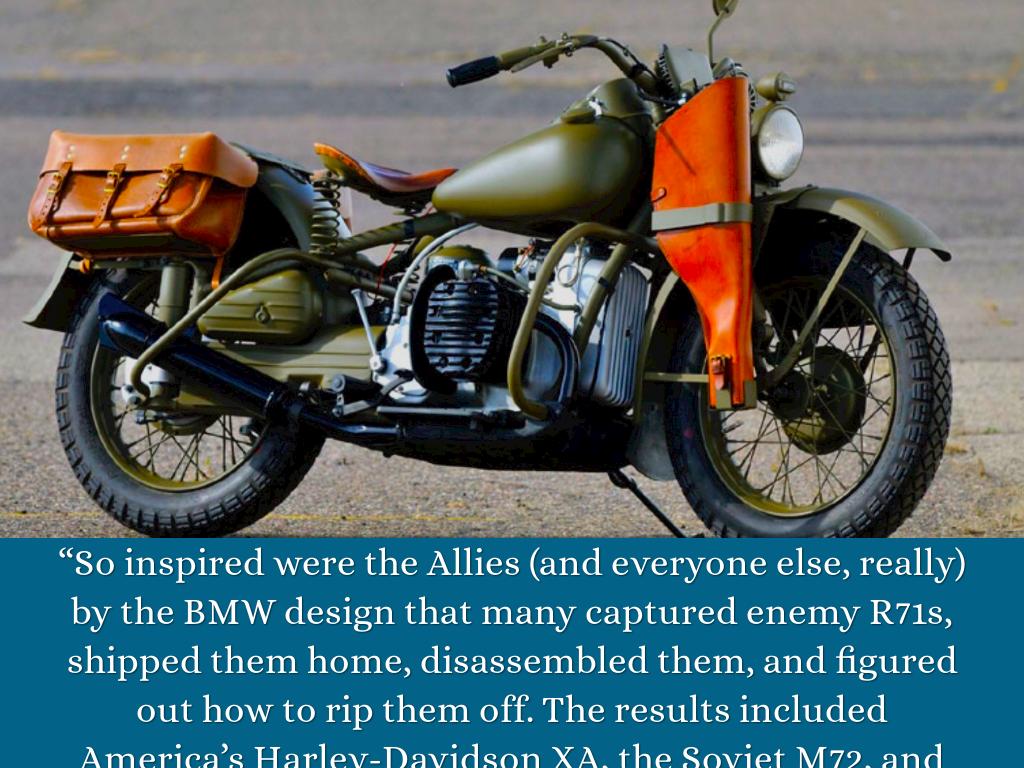 “So inspired were the Allies (and everyone else, really) by the BMW design that many captured enemy R71s, shipped them home, disassembled them, and figured out how to rip them off. The results included America’s Harley-Davidson XA, the Soviet M72, and the Chinese Chang Jiang 750.”