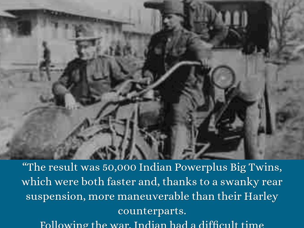 “The result was 50,000 Indian Powerplus Big Twins, which were both faster and, thanks to a swanky rear suspension, more maneuverable than their Harley counterparts.
