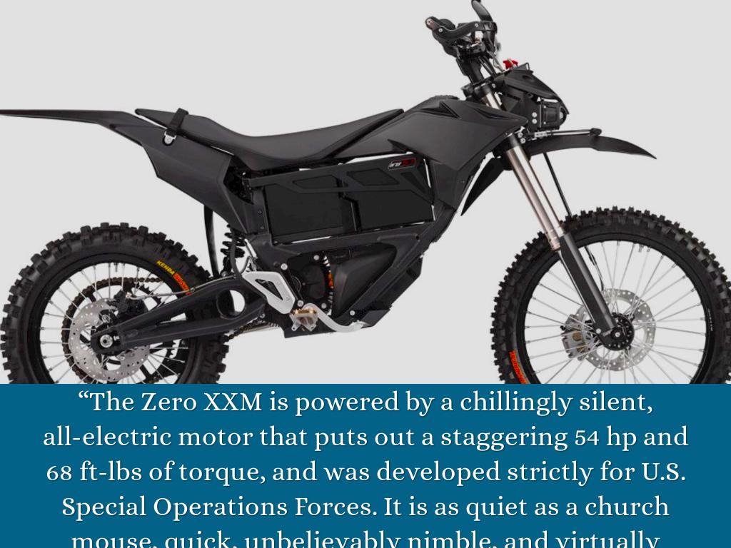 “The Zero XXM is powered by a chillingly silent, all-electric motor that puts out a staggering 54 hp and 68 ft-lbs of torque, and was developed strictly for U.S. Special Operations Forces. It is as quiet as a church mouse, quick, unbelievably nimble, and virtually maintenance-free, making it the perfect vehicle for things like low key recon missions, rescue attempts, covert operations, etc.