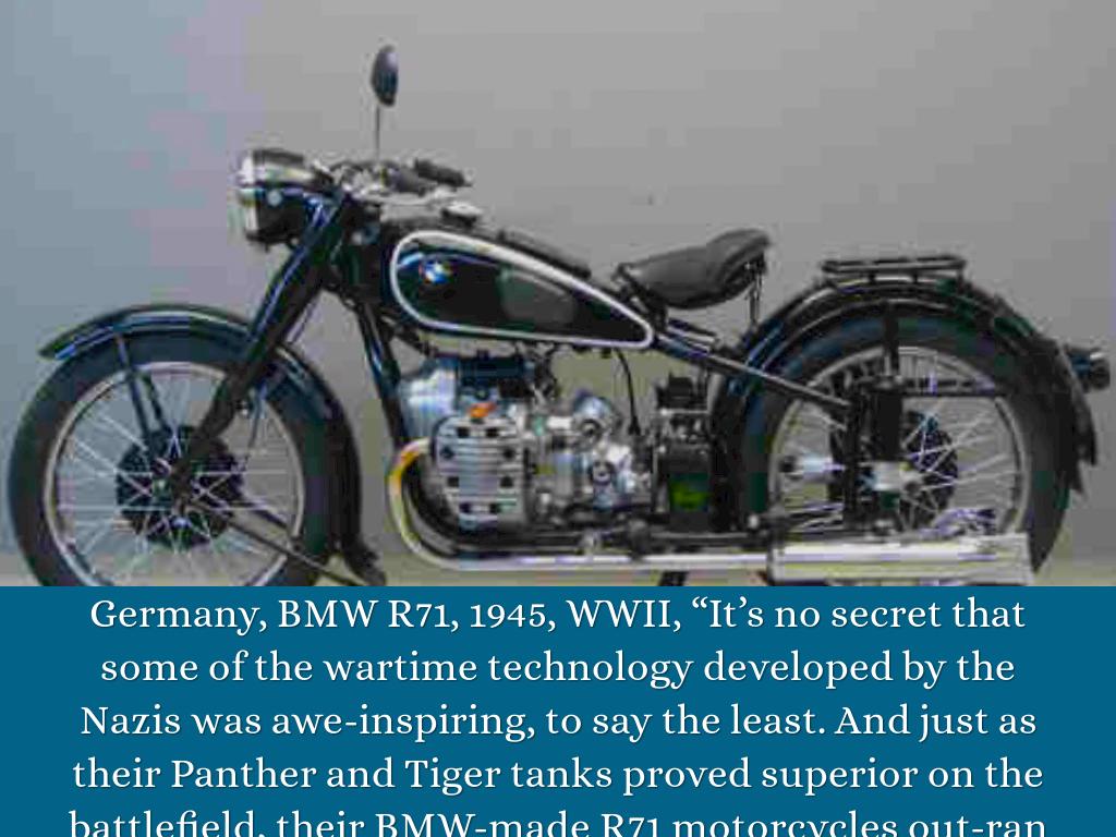 Germany, BMW R71, 1945, WWII, “It’s no secret that some of the wartime technology developed by the Nazis was awe-inspiring, to say the least. And just as their Panther and Tiger tanks proved superior on the battlefield, their BMW-made R71 motorcycles out-ran the Allies in the fields.”