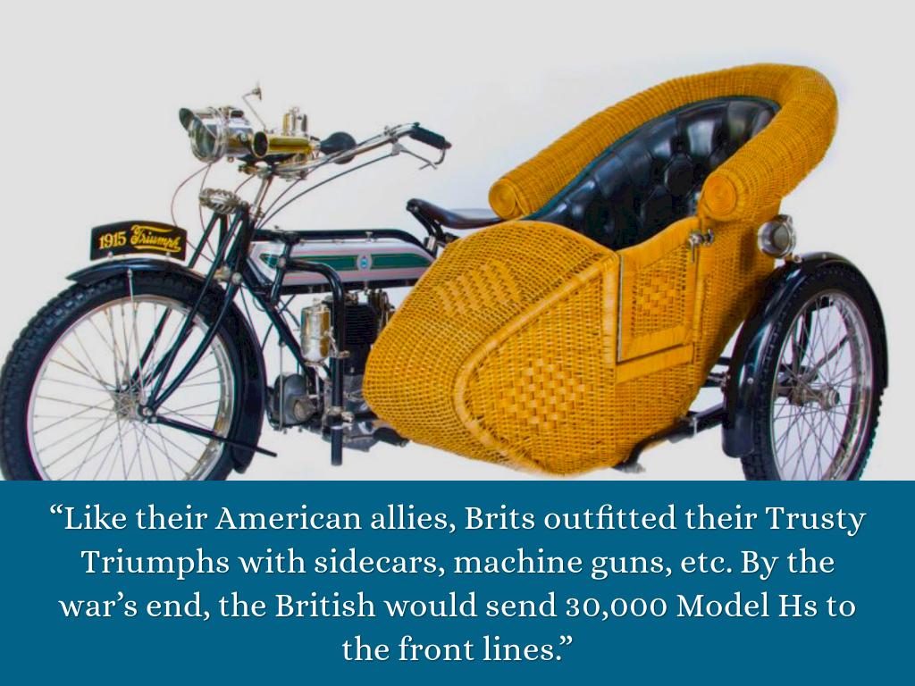 “Like their American allies, Brits outfitted their Trusty Triumphs with sidecars, machine guns, etc. By the war’s end, the British would send 30,000 Model Hs to the front lines.”