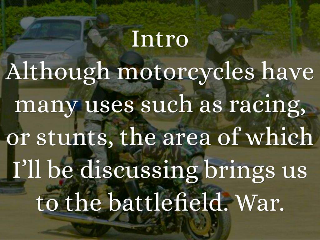Although motorcycles have many uses such as racing, or stunts, the area of which I’ll be discussing brings us to the battlefield. War.