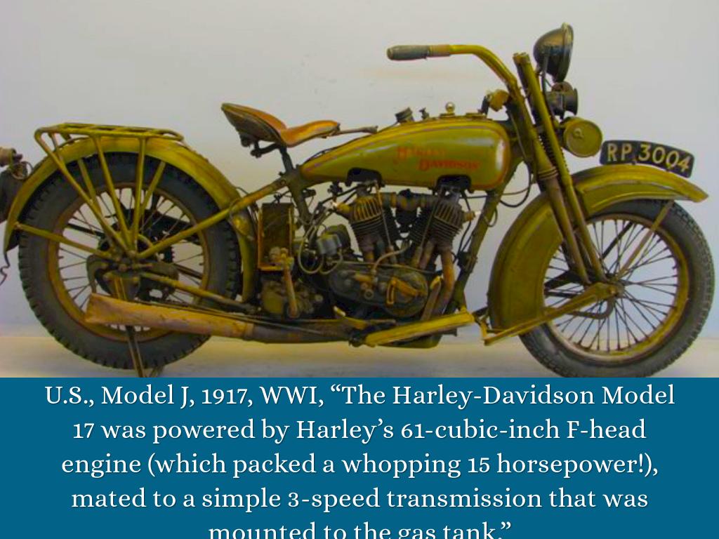U.S., Model J, 1917, WWI, “The Harley-Davidson Model 17 was powered by Harley’s 61-cubic-inch F-head engine (which packed a whopping 15 horsepower!), mated to a simple 3-speed transmission that was mounted to the gas tank.”