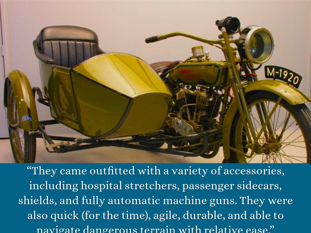 “They came outfitted with a variety of accessories, including hospital stretchers, passenger sidecars, shields, and fully automatic machine guns. They were also quick (for the time), agile, durable, and able to navigate dangerous terrain with relative ease.”