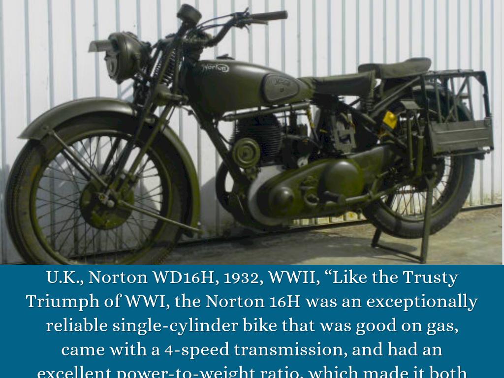 U.K., Norton WD16H, 1932, WWII, “Like the Trusty Triumph of WWI, the Norton 16H was an exceptionally reliable single-cylinder bike that was good on gas, came with a 4-speed transmission, and had an excellent power-to-weight ratio, which made it both quick and nimble on the battlefield. By the end of the war, Norton had produced over 100,000 WD16Hs for the British Royal Army.”