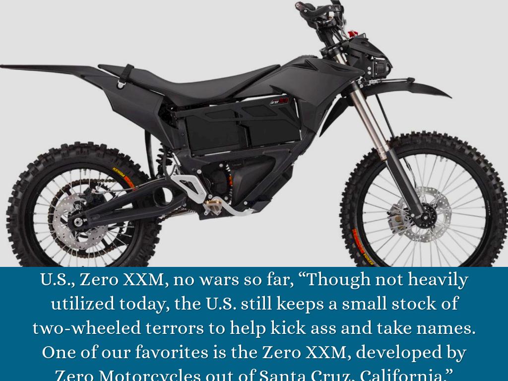 U.S., Zero XXM, no wars so far, “Though not heavily utilized today, the U.S. still keeps a small stock of two-wheeled terrors to help kick ass and take names. One of our favorites is the Zero XXM, developed by Zero Motorcycles out of Santa Cruz, California.”
