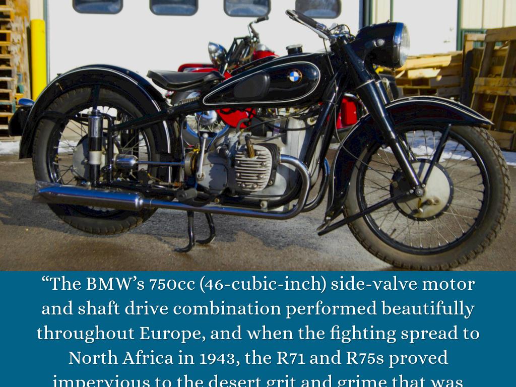 “The BMW’s 750cc (46-cubic-inch) side-valve motor and shaft drive combination performed beautifully throughout Europe, and when the fighting spread to North Africa in 1943, the R71 and R75s proved impervious to the desert grit and grime that was wreaking havoc on the Allies’ chain-driven bikes.”