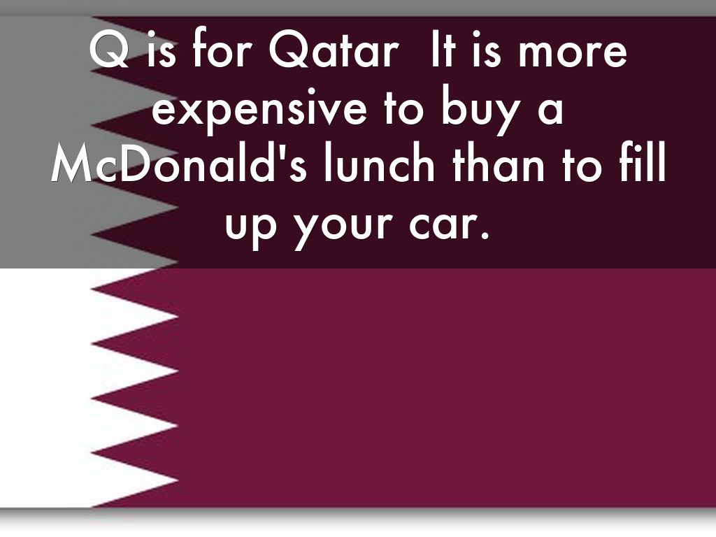 Q is for Qatar It is more expensive to buy a McDonald's lunch than to fill up your car.