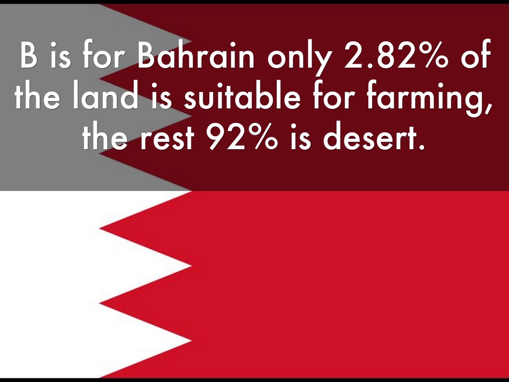 B is for Bahrain only 2.82% of the land is suitable for farming, the rest 92% is desert.