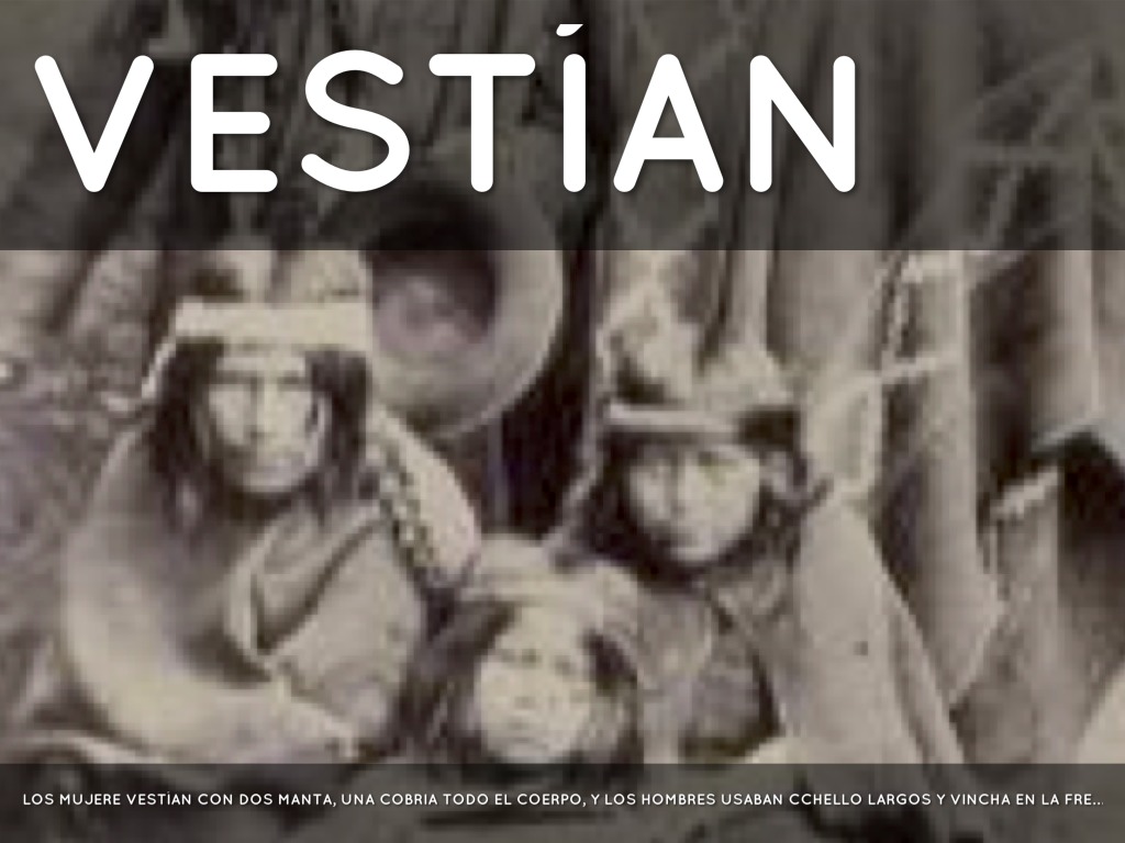 LOS MUJERE VESTÍAN CON DOS MANTA, UNA COBRIA TODO EL COERPO, Y LOS HOMBRES USABAN CCHELLO LARGOS Y VINCHA EN LA FRENTE
