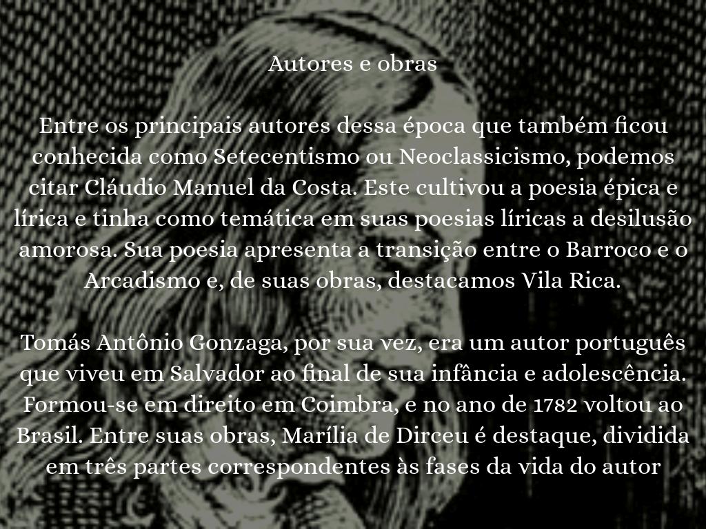 Entre os principais autores dessa época que também ficou conhecida como Setecentismo ou Neoclassicismo, podemos citar Cláudio Manuel da Costa. Este cultivou a poesia épica e lírica e tinha como temática em suas poesias líricas a desilusão amorosa. Sua poesia apresenta a transição entre o Barroco e o Arcadismo e, de suas obras, destacamos Vila Rica.
