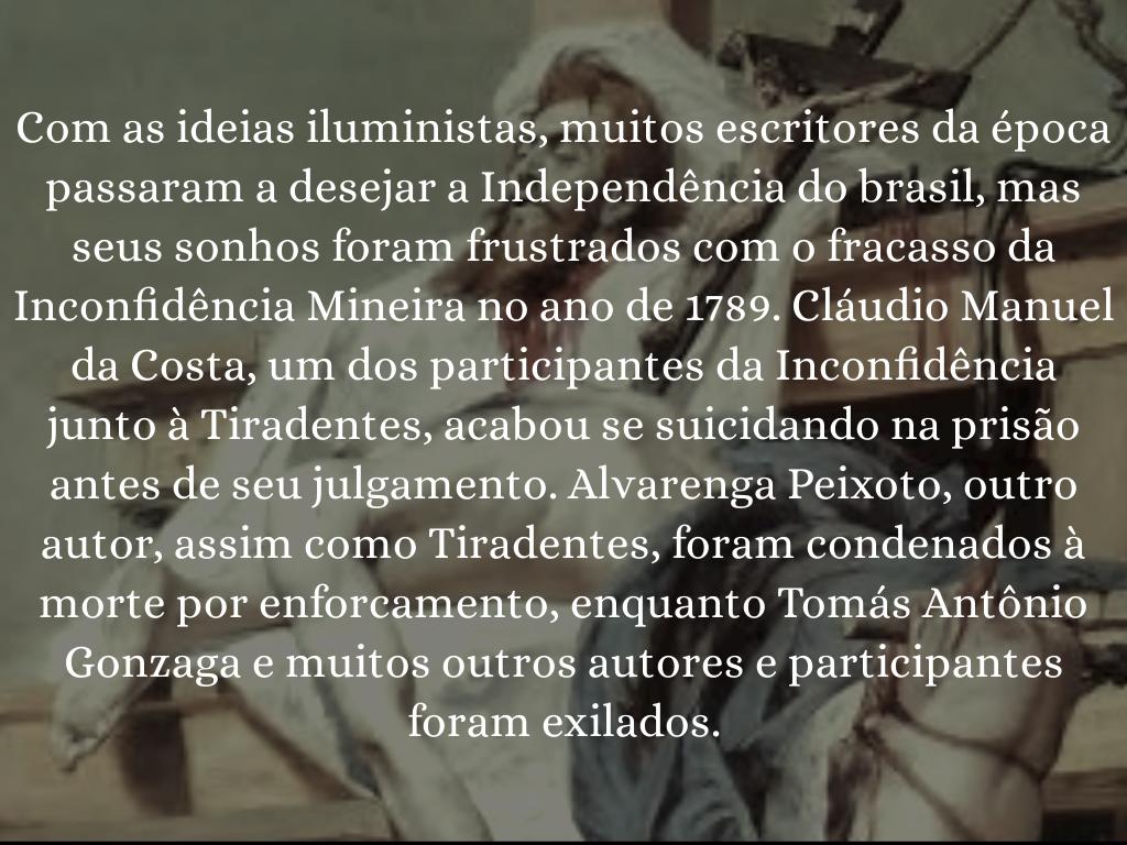 Com as ideias iluministas, muitos escritores da época passaram a desejar a Independência do brasil, mas seus sonhos foram frustrados com o fracasso da Inconfidência Mineira no ano de 1789. Cláudio Manuel da Costa, um dos participantes da Inconfidência junto à Tiradentes, acabou se suicidando na prisão antes de seu julgamento. Alvarenga Peixoto, outro autor, assim como Tiradentes, foram condenados à morte por enforcamento, enquanto Tomás Antônio Gonzaga e muitos outros autores e participantes foram exilados.