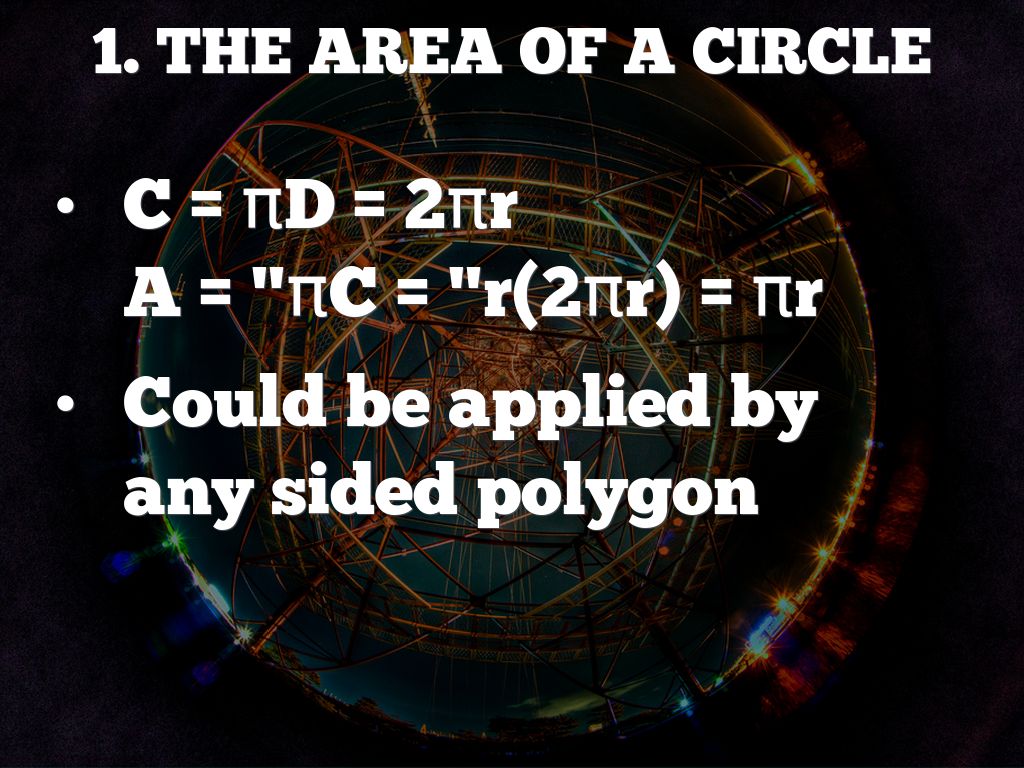 C = πD = 2πr A = "πC = "r(2πr) = πr