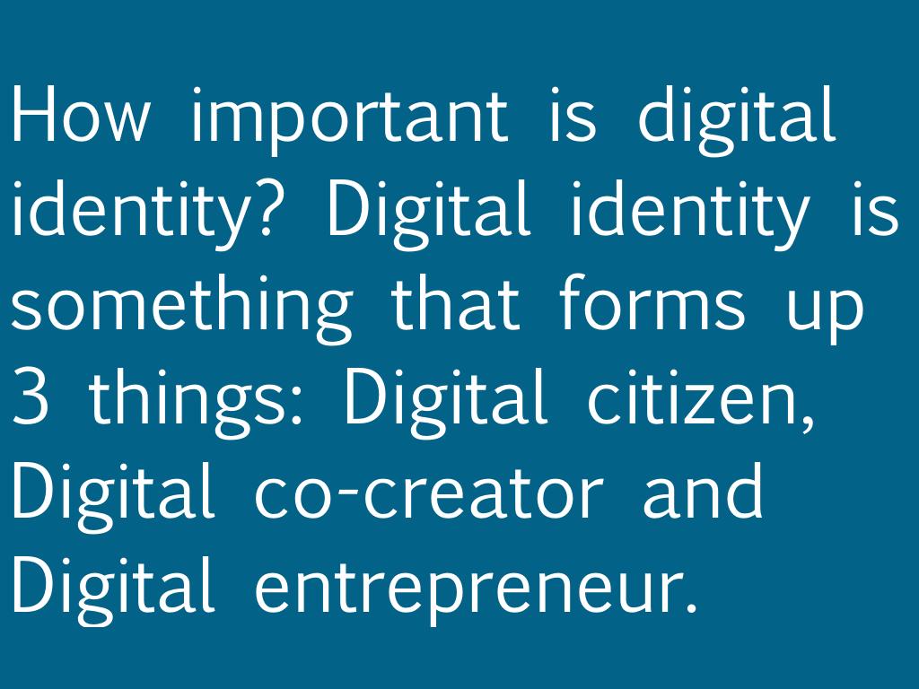 How important is digital identity? Digital identity is something that forms up 3 things: Digital citizen, Digital co-creator and Digital entrepreneur.